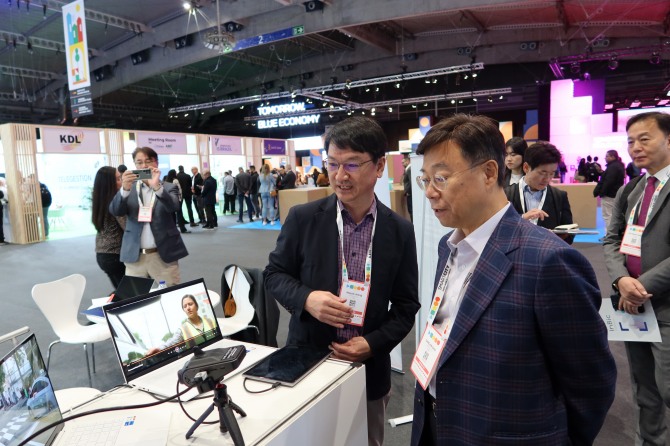 신상진 성남시장이‘2023 스페인 스마트시티 엑스포 월드 콩그레스(SCEWC2023)’참관해 기술 설명을 듣고 있다. 사진=성남시이미지 확대보기