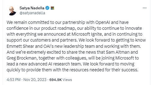 사티아 나델라 마이크로소프트 최고경영자(CEO)는 오픈AI를 나온 샘 알트만 전 CEO와 그레그 블록먼 전 회장이 새로운 고도의 인공지능(AI) 연구팀을 이끌기 위해 마이크로소프트에 입사한다고 X(옛 트위터)를 통해 밝혔다.