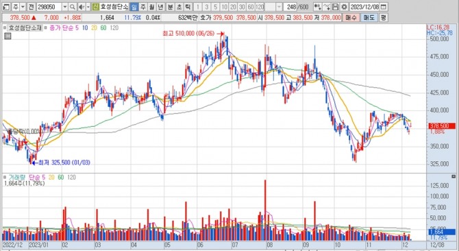 이미지 확대보기효성첨단소재의 주가는 8일 오전 9시 10분 현재 전일보다 7000원(1.88%) 오른 37만8500원에 매매되고 있다.