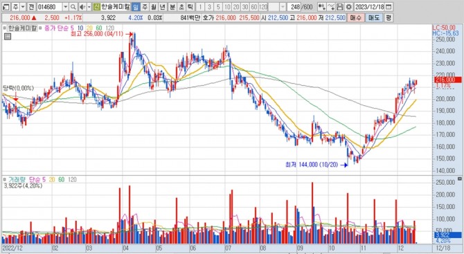 이미지 확대보기한솔케미칼의 주가는 18일 오전 9시 25분 현재 전일보다 2500원(1.17%) 오른 21만6000원에 매매되고 있다.