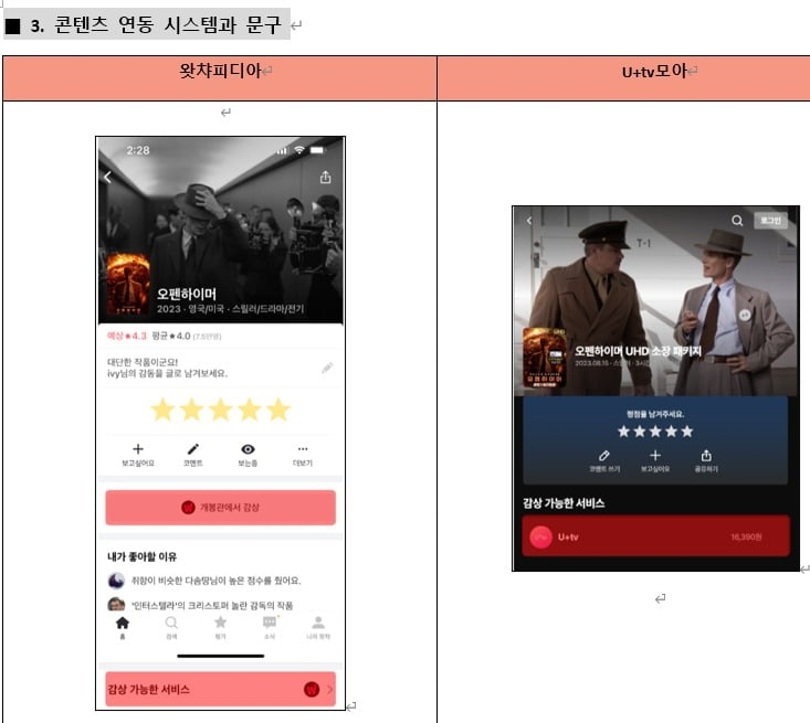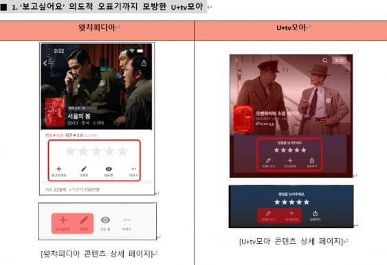 이미지 확대보기왓챠가 예시로 제공한 자료를 살펴보면 '왓챠피디아 콘텐츠 상세 페이지'와 'U+tv모아 콘텐츠 상세 페이지'의 포스터 이미지 위치, 별점 리뷰 위치 등이 흡사하다. 특히 보고싶은 콘텐츠로 즐겨찾기하는 항목을 '보고싶어요'로 표기한 것까지 'U+tv모아 콘텐츠 상세 페이지'에 동일하게 구성돼 있었다.