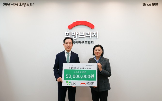 이미지 확대보기29일 희망브리지에 따르면 LK의 사회적 가치 실현은 이번이 처음이 아니다. 지난해 말에도 임직원이 모은 5000만원을 전해와 겨울철 한파에 노출된 노숙인 960명에게 방한모자, 핫팩, 삼계탕 등으로 구성된 방한키트를 전달한 바 있다. 이번에 전달된 후원금은 내년도 재난취약계층 등을 위해 쓰여질 예정이다.