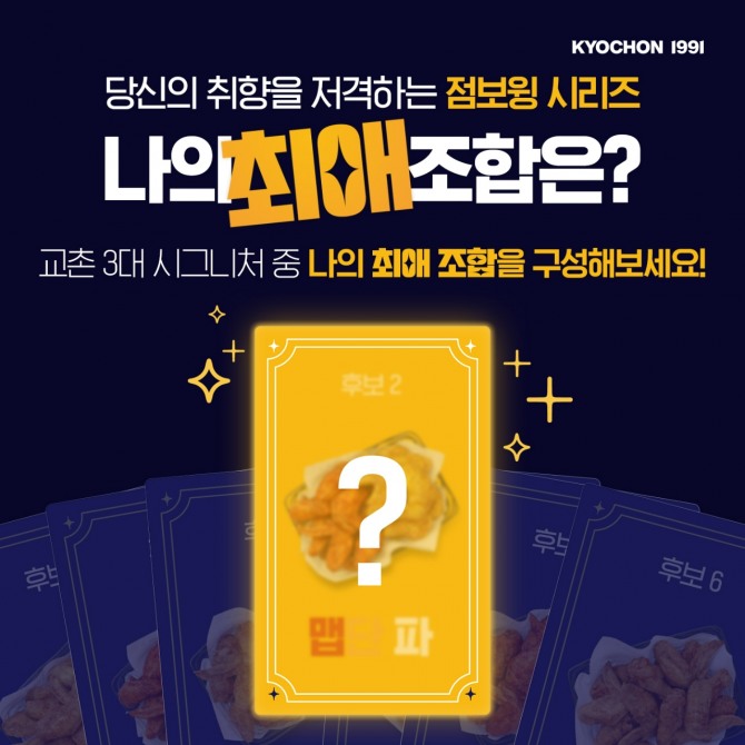 이미지 확대보기교촌에프앤비(주)가 이달 말까지 점보윙 시리즈 ‘최애 조합’ 공유 이벤트를 열고, 신년 맞이 치킨 메뉴 교환권 선물에 나선다. 이번 행사는 교촌치킨앱 회원을 대상으로 진행되며 ▲반반점보윙(교촌/레드, 교촌/허니, 레드/허니) ▲교촌점보윙 ▲레드점보윙 ▲허니점보윙 6가지 점보윙 시리즈 중 ‘최애’(가장 좋아하는) 조합을 공유하는 이벤트다.