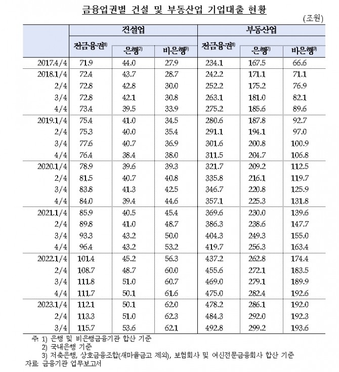 전체 금융권의 건설·부동산업 대출 잔액은 608조5000억원으로 전년 동기 대비 4.8% 늘었다. 이는 2년 전 497조6000억원보다 22.3% 늘어난 수치로 2023년 3분기에 역대 최대를 기록한 것이다.