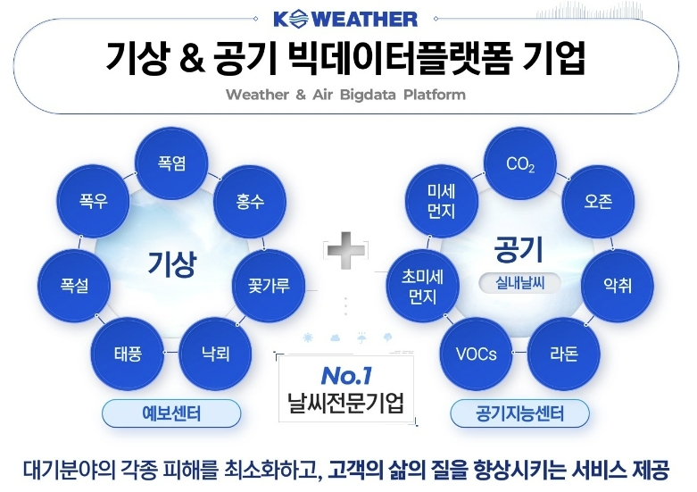 케이웨더는 날씨 빅데이터 플랫폼을 통해 개인과 기업들에게 기상 관련 일상 생활과 활동에 영향을 줄 수 있는 정보를 제공한다. 현재 기상 상태를 분석하고 미래 기상 데이터 예측 정보를 제공해 이용자들이 관련 리스크를 관리할 수 있도록 맞춤형 콘텐츠도 제작한다.