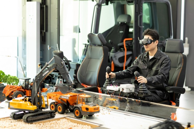 건설 현장을 모사한 실내 훈련장에서는 실제 장비의 컨트롤러로 RC모델을 조종할 수 있다. VR 고글을 착용하면 실제 장비 운전석과 동일한 1인칭 시각으로 RC모델을 운전할 수 있어 현실성을 높였다.