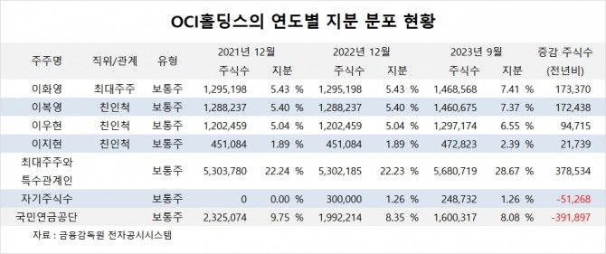 이우현 부회장은 OCI 인적분할로 인해 OCI홀딩스의 지분이 5.04%→6.55%, 이화영 회장의 지분이 5.43%→7.41%, 이복영 회장의 지분이 5.40%→7.37%로 각각 높아졌다.