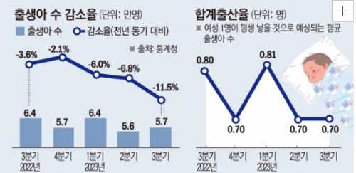 특히 여성 1명이 평생 낳을 것으로 예상되는 평균 출생아 수를 뜻하는 합계출산율이 지난해 3분기 0.7명으로 OECD(경제협력개발기구) 38개 회원국 중 가장 낮을 정도로 저출산이 심각해지면서 올해는 아동 인구가 700만명 밑으로 내려갈 것으로 보인다.