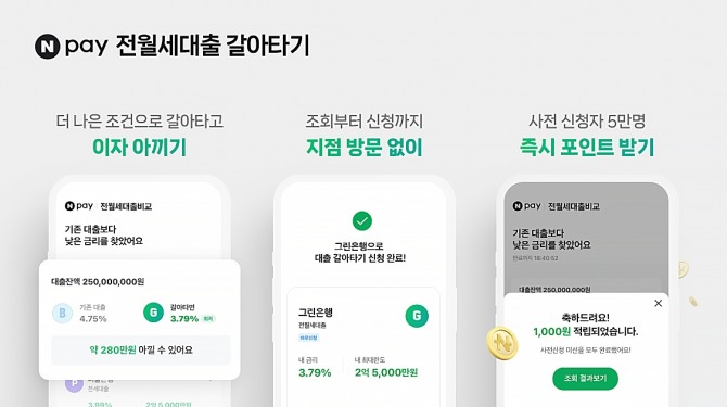 이미지 확대보기네이버페이가 인터넷은행과 시중은행 등 업계 최다 수준인 6개 금융사와의 제휴로 '전월세대출 갈아타기' 서비스를 출시했다. 네이버페이 '전월세대출 갈아타기'는 케이뱅크를 비롯해 신한은행, 하나은행, 우리은행, IBK기업은행, 경남은행 등 6개 금융사와 함께 시작하며, 향후 제휴 금융사를 지속 확대해 나갈 예정이다.