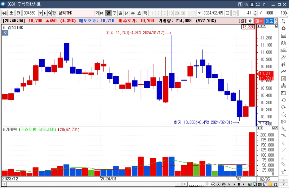 5일 한국거래소에 따르면, 이날 정규 거래에서 삼익THK 종목은 4.39% 상승한 1만700원에 거래를 마감했지만, 이어진 시간외 거래에서 9.39% 상승한 1만1770원에 거래를 마쳤다.