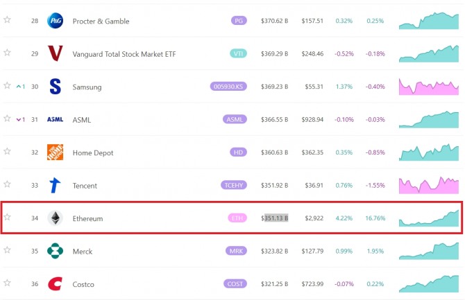 이미지 확대보기주요 자산의 시가총액 순위를 볼 수 있는 인피니트마켓캡 내 이더리움 시가총액. 텐센트의 시가총액에 거의 근접했다. 자료=인피니트마켓캡