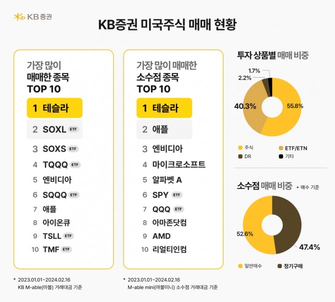 이미지 확대보기KB증권은 작년 1월부터 올해 2월 16일까지 KB증권 MTS ‘KB M-able(마블)’과 ‘M-able mini(마블미니)’를 통해 고객들이 가장 많이 매매한 미국주식의 종목 현황을 분석했다고 28일 밝혔다.