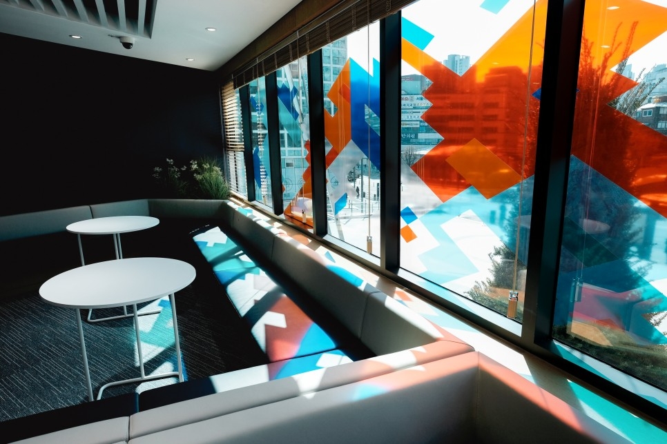 이곳에는 국내외에서 활발히 활동하는 정크하우스 소수영 작가와 크리스티안 스톰 작가가 참여해 주차장 외벽 유리면을 여러 색의 투명 컬러 필름으로 디자인했다.