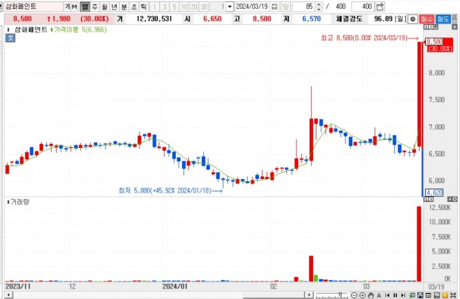 이미지 확대보기19일 한국거래소에 따르면 삼화페인트 주가는 이날 오후 1시 37분 현재 전 거래일 대비 30% 상승한 8,580원에 거래되고 있다.