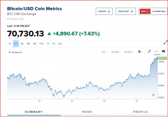 이미지 확대보기26일 뉴욕증시와 가상화폐 거래소 등에 따르면 대장주 비트코인이 7만 달러선을 회복했다. 미국 뉴욕증시 상장사인 가상화폐 거래소 코인베이스에 따르면 비트코인 1개당 가격은 7.43% 급등했다. , 비트코인이 7만 달러선을 회복한 것은 지난 3월14일 이후 11일 만이다. 미국 뉴욕증시는 반도체 및 기술 관련주들이 하락세를 보이면서 약세이다. 뉴욕증권거래소(NYSE)에서 다우존스30산업평균지수와 스탠더드앤드푸어스(S&P)500지수 그리고 나스닥지수 모두 하락이다, 뉴욕증시 투자자들은 기술기업들의 주가 조정, 연방준비제도(연준·Fed)의 금리 인하 기대 등을 주시하고 있다. 중국이 자국 정부 기관에서 미국 컴퓨터 기업 인텔과 AMD의 마이크로프로세서를 탑재한 개인용 컴퓨터(PC)와 서버를 퇴출하는 내용의 새 가이드라인을 도입했다는 소식에 반도체 관련주들이 흔들리고 있다,