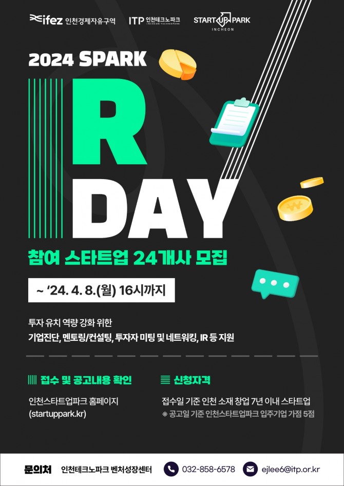 지원 대상은 혁신 제품 및 서비스를 보유한 투자유치 희망 스타트업, 인천 소재 기업(공고일 기준 인천 소재지 창업 7년 이내 기업) 등이며 인천스타트업파크 입주기업에 대해서는 가점이 부여된다.