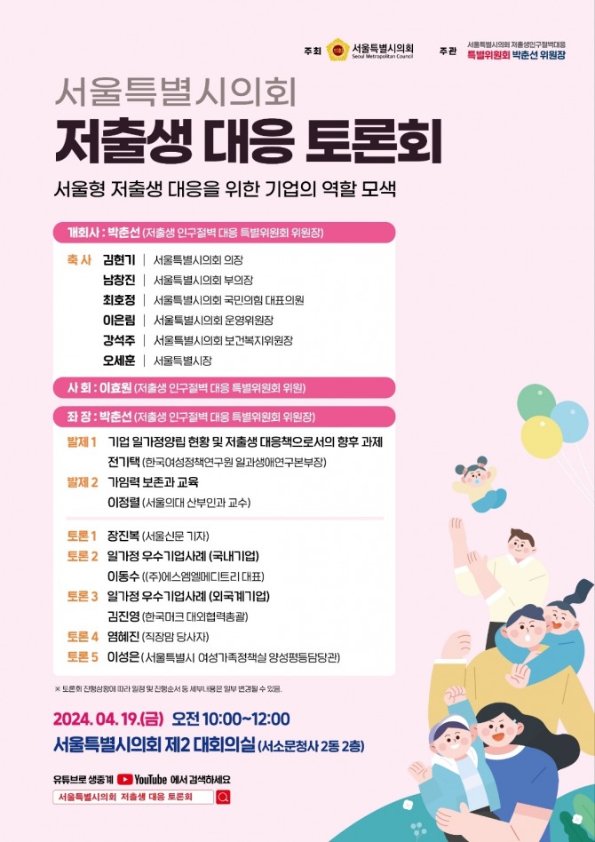 한편 이번 토론회에서는 일가정양립을 통해 출산문화를 장려하고 있는 ㈜에스엠엘메디트리, ㈜소리를보는통로, 한국머크에 대한 서울시의회 의장 표창 시상식도 함께 진행된다. 또한 현장 참석과 함께 유튜브로도 토론회 진행사항을 생중계해 시민들의 참여의 장을 확대할 계획이다.
