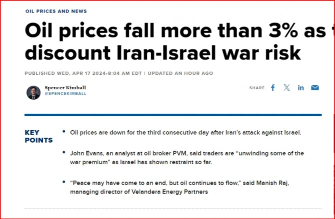 이란과 이스라엘이 전면전에 나설 경우 원유 시장의 공급이 차질을 빚을 것이라는 전망은 다소 누그러졌다. 원유시장은 지정학적 위험에 대한 긴장을 일부 풀었다. 이란에 대한 경제 제재 가능성은 여전히 지켜봐야 할 요인이다.