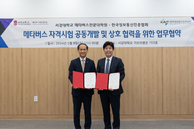 한국정보통신진흥협회와 서강대학교는 8일 서강대학교 삼성가브리엘관에서 '메타버스빌더' 자격 공동 개발・시행 및 디지털 인재 양성을 위한 업무협약(MOU)을 체결했다고 밝혔다.