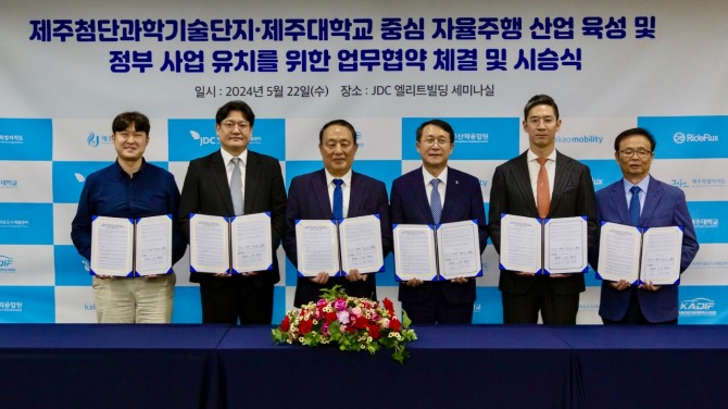 이번 협약에는 JDC를 비롯해 △제주특별자치도 △제주대학교 △자율주행기술개발혁신사업단(이하 KADIF) △제주산학융합원 △카카오모빌리티, △라이드플럭스가 참여했다.
