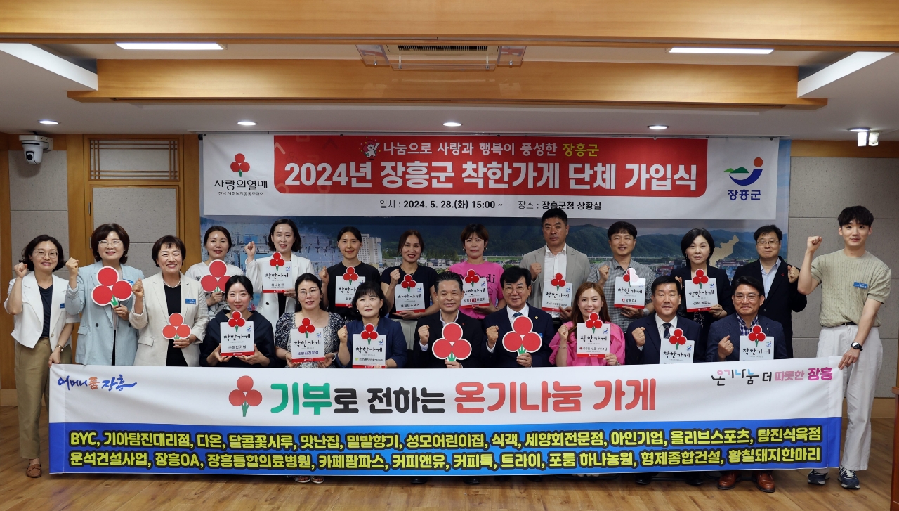 이날 가입한 착한가게는 BYC 장흥점, 기아탐진대리점, 다온, 달콤꽃시루, 맛난집, 밀밭향기, 성모어린이집, 식객, 세양회전문점, 아인기업, 올리브스포츠, 탐진식육점, 운석건설사업, 장흥OA, 장흥통합의료병원, 카페팜파스, 커피앤유, 커피톡, 트라이, 포룸, 하나농원, 형제종합건설, 황칠돼지한마리 등 23개소다.