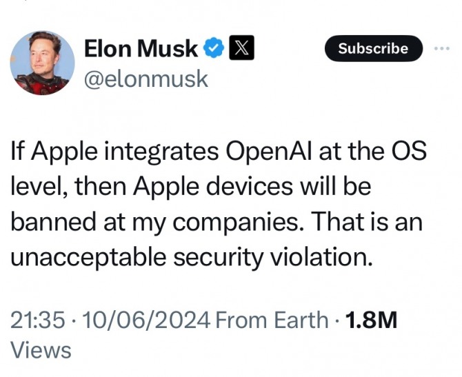로이터통신에 따르면 머스크 CEO는 이날 X에 올린 글에서 “만약 애플이 오픈AI의 기술을 운영체제 수준에서 자사 기기에 통합시킨다면 보안에 매우 심각한 구멍이 뚫릴 것”이라면서 “그렇게 된다면 내가 거느린 회사들에서는 애플 기기의 사용이 전면 금지될 것”이라고 밝혔다.
