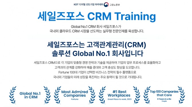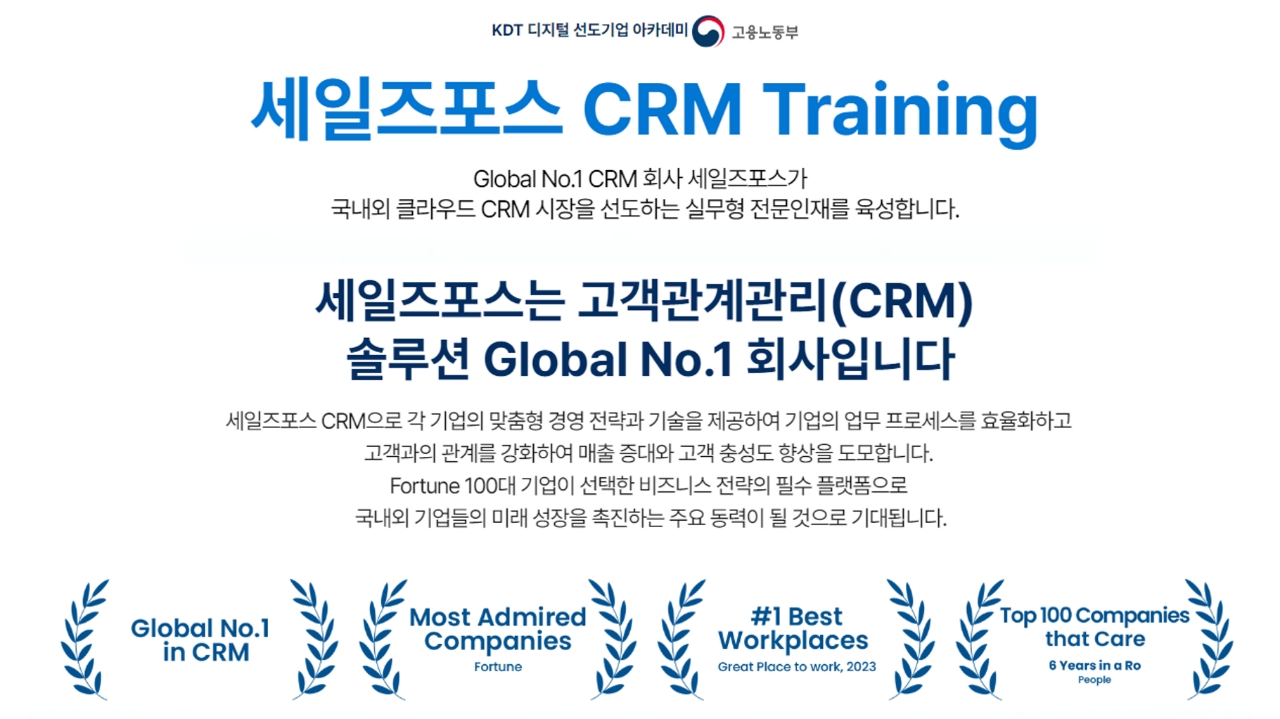 '청년 CRM 101 아카데미'는 CRM 업체 세일즈포스가 국내외 클라우드 CRM 시장을 선도할 실무형 전문 인재를 육성하기 위해 대한상공회의소, 고용노동부와 함께 추진하는 '첨단 산업·디지털 선도기업 아카데미'의 하나로 운영하는 교육 프로그램이다. 지난 4월 1기 수료식을 마치고, 최근 2기 모집을 마감했다.