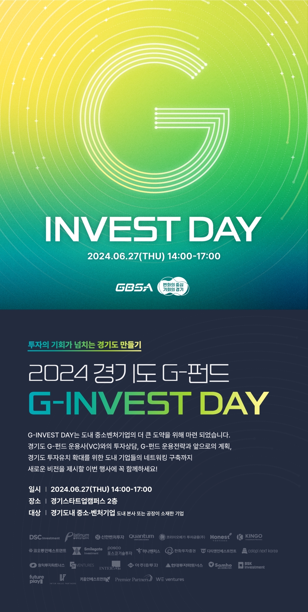 경기도와 경기도경제과학진흥원(이하 경과원)이 중소벤처기업을 위해 새로운 투자 시대를 개막하는 '2024 G-Invest Day'를 27일 오후 2시 판교 스타트업캠퍼스에서 개최한다.'G-Invest Day'는 ‘더 깊은, 더 새로운, 더 가까운 기회’를 모토로, 도내 중소벤처기업 투자 기회 확대와 경기도 투자유치를 활성화하는 장이 될 전망이다.