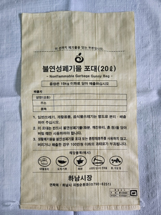 불연성폐기물 포대는 하남시청 홈페이지에서 ‘종량제물품 지정판매소’를 검색해 확인한 지정판매소를 방문해 10리터(1000원)와 20리터(2000원) 두 종류의 포대를 구매할 수 있다. 다만 포대를 판매하는 지정판매소를 방문하기 어려운 경우를 고려해 대형폐기물 스티커를 부착해 배출하는 기존 방식도 병행한다.