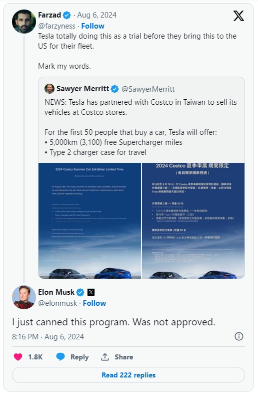일렉트렉에 따르면 테슬라는 대만에 소재한 코스트코 매장에서 테슬라 전기차를 구매하는 고객 50명에게 선착순으로 주행거리 5000km에 해당하는 슈퍼차저 무료 이용권 등을 제공하는 마케팅 협약을 코스트코 대만 지사와 체결했으나 머스크 CEO는 이날 X에 올린 글에서 “방금 이 마케팅 제휴를 백지화시켰다”고 밝혔다.