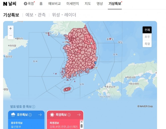 네이버는 날씨 페이지에 '폭염' 및 '기상특보' 탭을 신설했다. 기상재난 시 이용자들이 실시간 올린 지역별 날씨를 공유할 수 있도록 제보톡을 운영 중이다. 지난달에는 태풍 경로와 날씨 제보톡의 답글 알림 기능, 강수량·적설량 정보도 추가해 계절별 날씨 정보를 확인할 수 있도록 한 발 빠른 대처가 눈에 띈다.