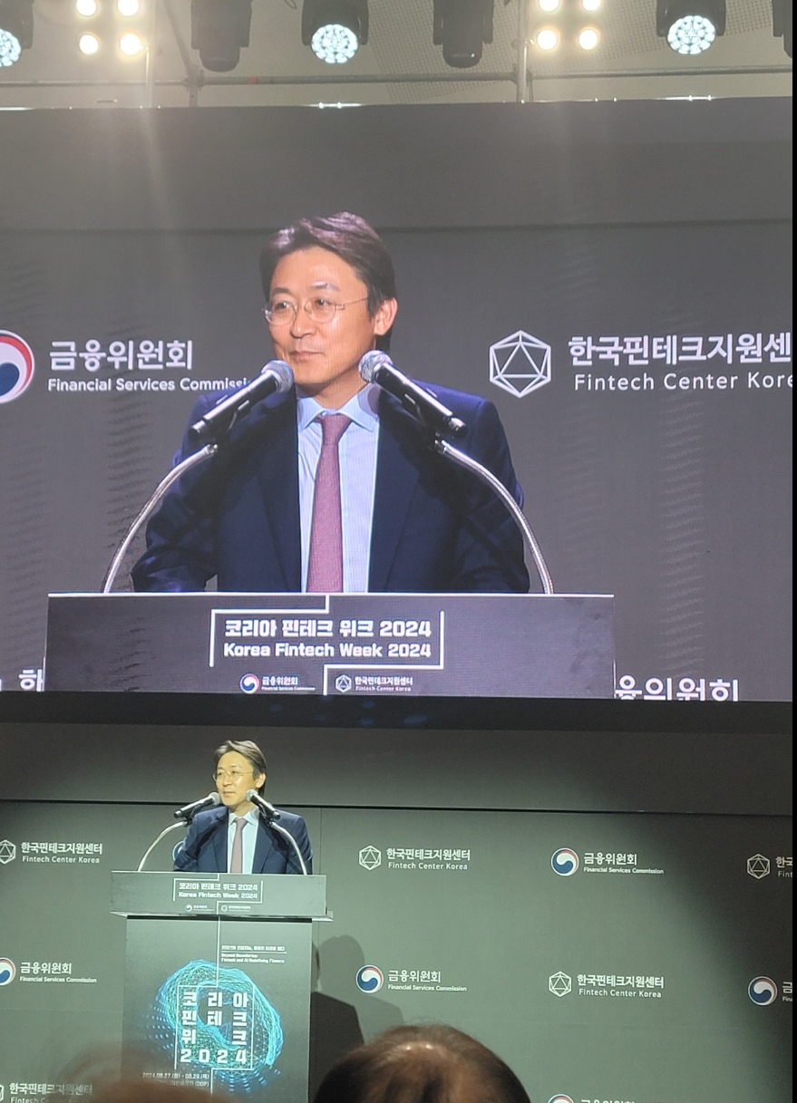 이미지 확대보기27일 동대문디자인플라자(DDP) 아트홀에서 열린 '코리아 핀테크 위크 2024' 행사에서 권대영 금융위원회 사무처장 주재로 선정식이 진행됐다.