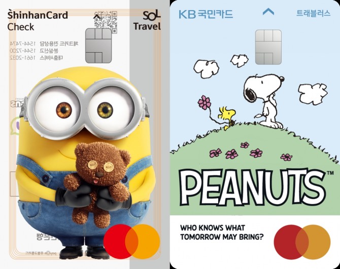 우선 신한카드는 인기 캐릭터인 미니언즈를 삽입한 ‘신한카드 쏠(SOL)트래블 체크카드’를 선뵀다. 이 체크카드는 네이버 웹툰 냐한남자와 짱구, 도라에몽 등에 이어 계속해서 캐릭터 디자인을 자랑한다.