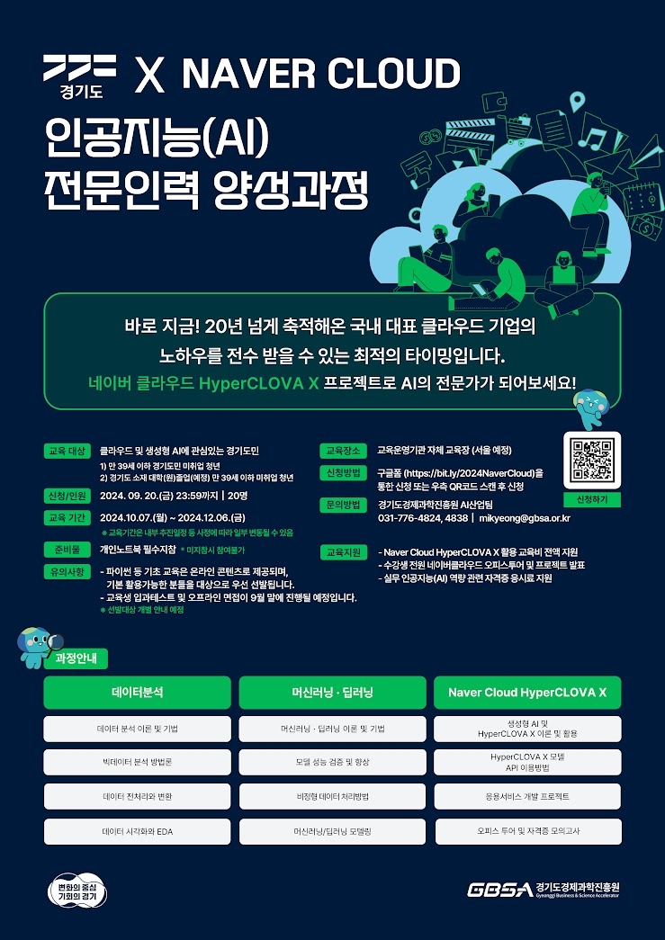 경기도와 경기도경제과학진흥원(이하 경과원)은 네이버클라우드와 협력해 ‘네이버클라우드 인공지능(AI) 전문인력 양성과정’의 교육생을 모집한다고 13일 밝혔다.