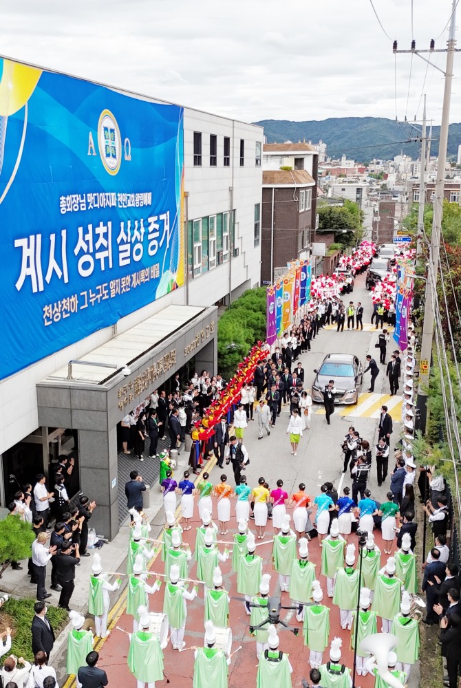 이미지 확대보기신천지 천안교회 교인들이 이만희 총회장 방문 환영 퍼포먼스를 하고 있다. 사진=신천지 천안교회