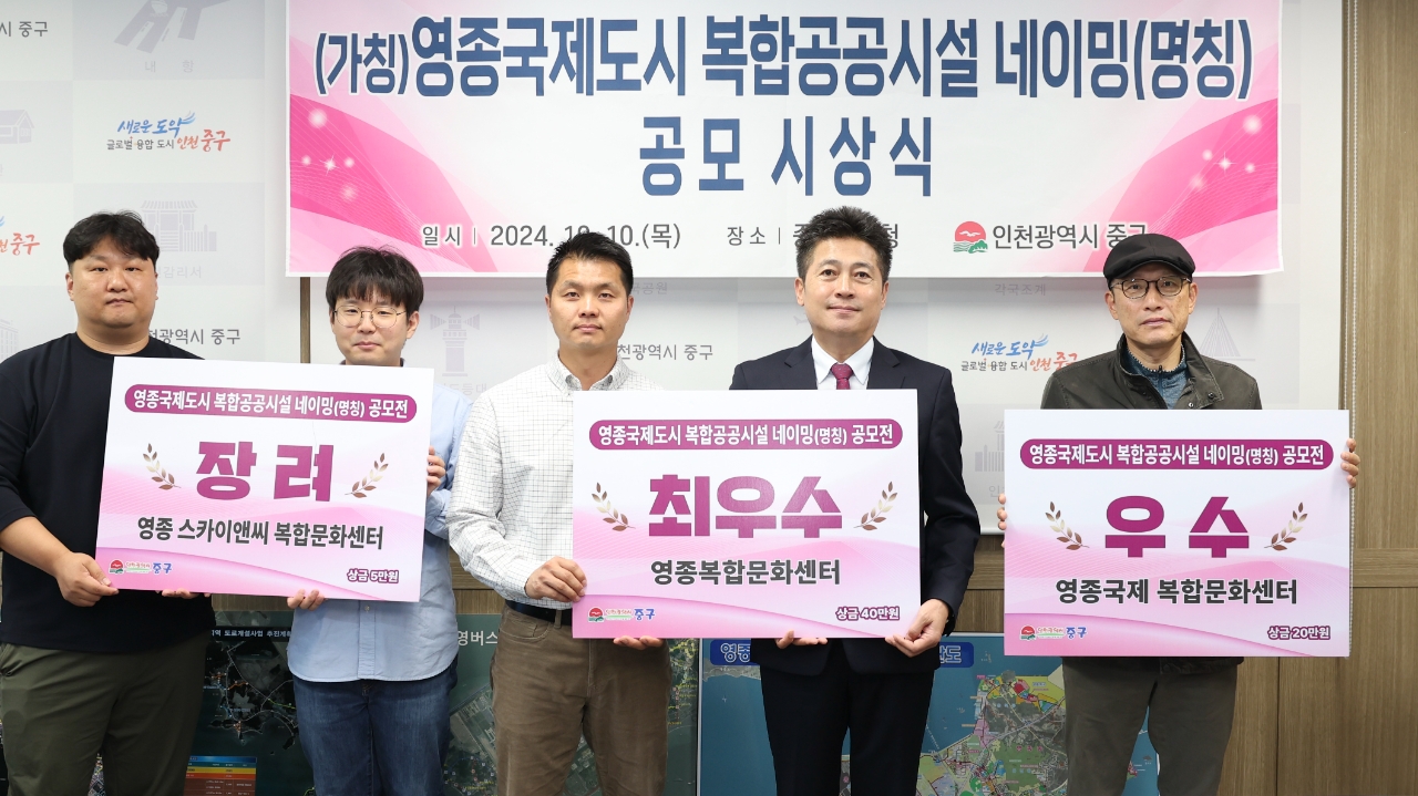 김정헌 중구청장은 “공모전에 대한 많은 관심과 성원에 진심으로 감사하다. 이번 영종국제도시 복합공공시설 건립사업을 통해 영종지역의 부족한 인프라를 확충해 질 높은 공공서비스를 주민들에게 제공하도록 노력하겠다”라고 말했다.