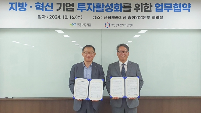채병호 신용보증기금 이사(왼쪽)와 박대희 대전창조경제혁신센터이 지난 16일 대전 신보 충청영업본부에서 열린 ‘지방·혁신창업 기업의 투자활성화를 위한 업무협약식’에 참석해 기념 촬영을 하고 있다. 사진=신보