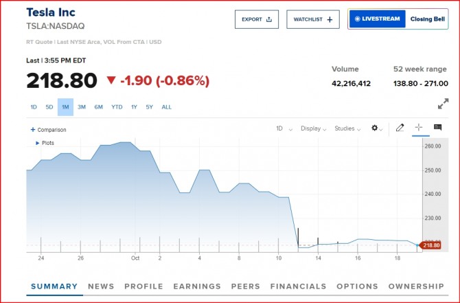 로보택시 이벤트 이후로 주가가 급락한 테슬라의 실적 발표가 23일로 다가왔다. 자율주행 차량에 대한 핵심정보나 세부 정보를 알리지 않았던 실망스러운 로보택시 이벤트와 달리 분기 실적 발표시간에는 전기차 판매 개선책이 나올지 투자자들은 궁금해하고 있다. 뉴욕증시 분석가들은 테슬라가 전기 자동차(EV) 구매자 인센티브로 인해 3분기 이익 마진이 감소했다고 보고할 것으로 예상하고 있다.
