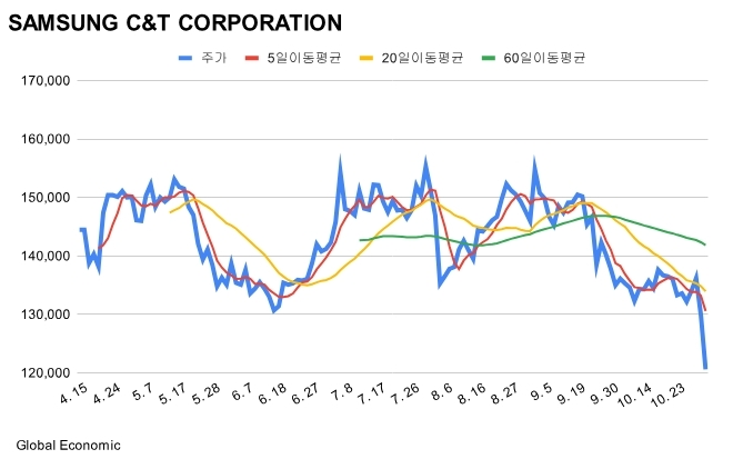 이미지 확대보기이날 한국거래소에 따르면 오전 11시16분 삼성물산은 전 거래일 대비 9300원(7.16%) 내린 12만600원에 거래 중이다. 이날 삼성물산은 장 중 최저 7.93% 하락해 11만9600원까지 떨어지기도 했다.