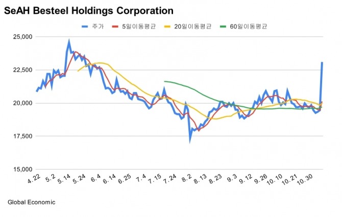 7일 한국거래소에 따르면, 오후 2시 40분 기준 세아베스틸지주는 전일 종가 대비 3640원(18.71%) 오른 2만3100원에 거래되고 있다.