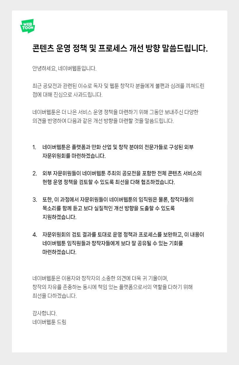 네이버웹툰은 22일 '콘텐츠 운영 정책 및 프로세스 개선 방향 말씀드립니다' 입장문을 공개했다. 서두에는 최근 공모전 관련 이슈로 독자 및 웹툰 창작자 분들에게 불편과 심려를 끼쳐드린 점에 대해 진심으로 사과드린다는 내용이 담겼다.