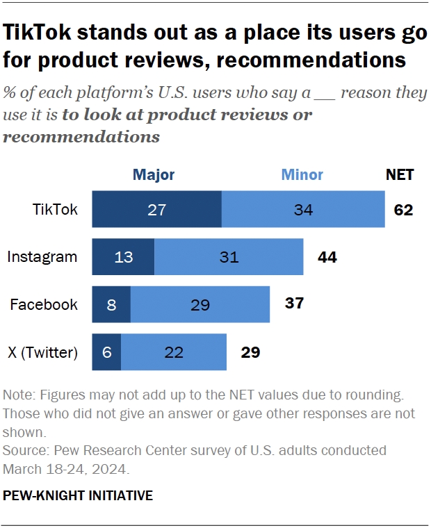 이에 비해 틱톡의 경쟁 소셜미디어에 속하는 인스타그램, 페이스북, X를 이용하는 미국인들은 제품 리뷰나 제품 추천과 관련해 접속한다는 응답률이 각각 44%, 37%, 29%로 나타나 틱톡에 비해 낮은 것으로 파악됐다.