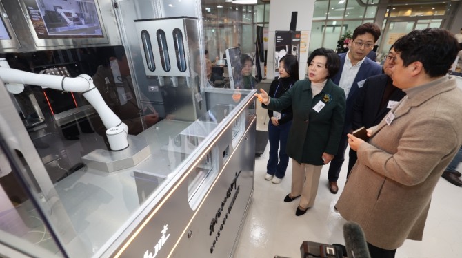 지난 2월 열린 과천시 창업지원센터 개소식 행사 현장에서 신계용 과천시장이 푸드테크 관련 기기를 살펴보고 있다. 사진=과천시이미지 확대보기