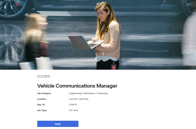 9일(이하 현지시각) 테슬라라티에 따르면 테슬라는 테슬라 홈페이지에 게시하는 채용 공고에 '차량 커뮤니케이션 매니저(vehicle communications manager)'라는 이름으로 광고·홍보 담당 인력을 모집 중이다.