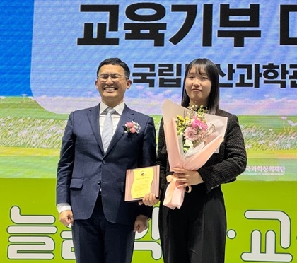 2024년 제13회 대한민국 교육기부 대상 시상식 모습. 정우성 한국과학창의재단 이사장(왼쪽), 국립부산과학관 교육연구실 이진희 연구원. 사진=국립부산과학관