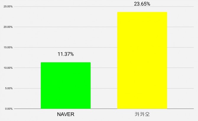 18일 한국거래소에 따르면, 네이버는 전 거래일 대비 1.43%(3000원) 오른 21만2500원에 거래를 마쳤고, 카카오는 1.28%(550원) 오른 4만3400원에 거래를 마감했다.