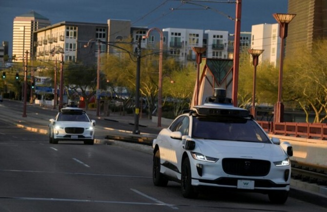 2대의 웨이모 자율주행차가 미국 애리조나주 피닉스의 센트럴 애비뉴를 스스로 주행하고 있다. 사진=로이터