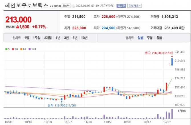 이미지 확대보기3일 한국거래소에 따르면 레인보우로보틱스는 이날 오전 9시19분 전일 대비 0.71% 오른 21만3000원에 거래중이다. 전날 종가는 21만1500원이었다.