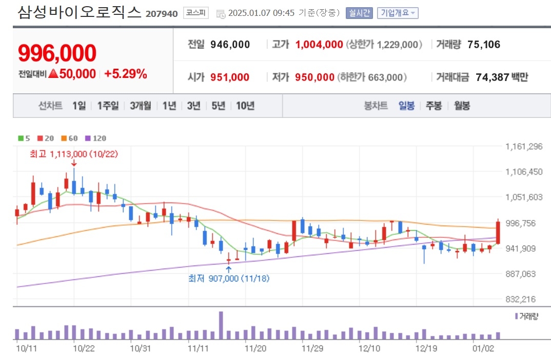 이미지 확대보기7일 한국거래소에 따르면 오전 9시45분 기준 삼성바이오로직스는 전 거래일보다 5.29%오른 99만6000원에 거래되고 있다.