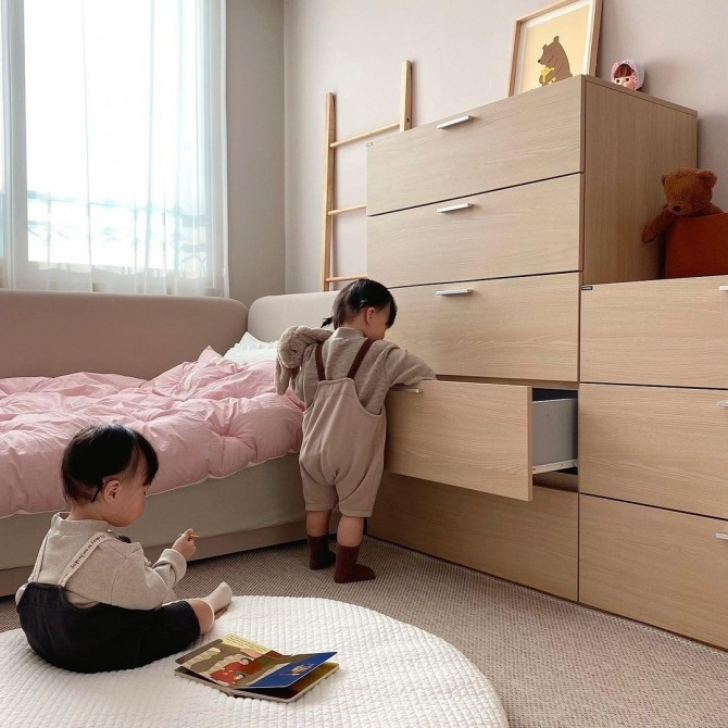 활동적이고 호기심이 많은 아이들은 가구에 오르내리거나 매달리기도 해 안전성과 내구성을 고려하는 것이 중요하다. 또 예측 불가능한 행동도 많이 하기 때문에 부상 위험이 있는 날카롭거나 불안정한 구조의 가구는 피해야 한다. 서랍장의 경우, 사고를 방지하기 위해 의무적으로 시험해야 하는 높이는 76.2cm다. 어린이가 사용할 서랍장은 그 이하의 높이라도 전도 테스트를 완료했는지 확인하는 것이 좋다.